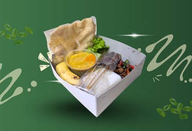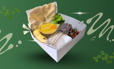 Nasi Putih, sate 2 tusuk, gulai, oseng tempe, lalapan, kerupuk udang, buah, sendok makan, tisu, & lembar nama.